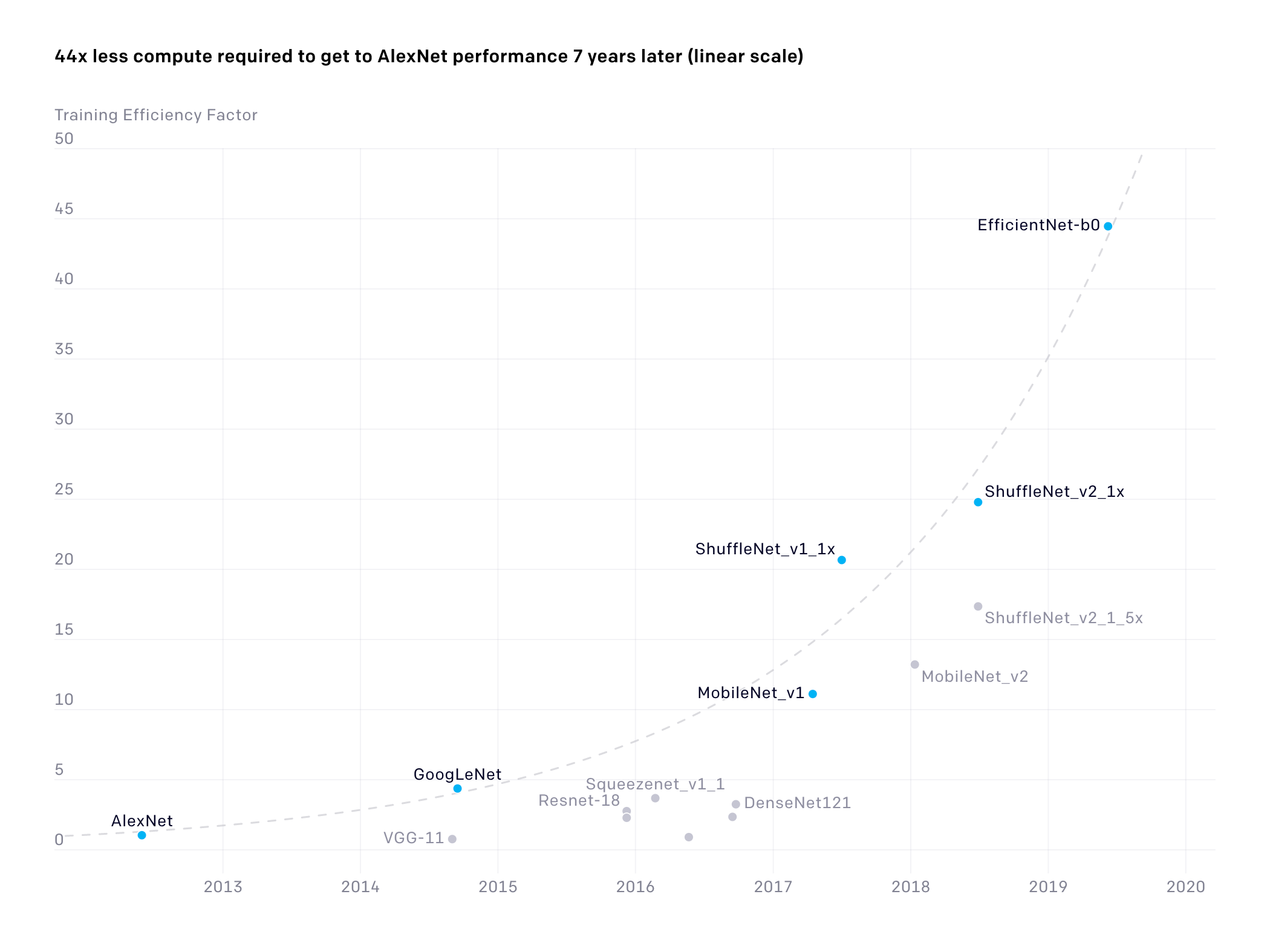Figure 2: Increase of efficiency used to train to AlexNet level performance (from https://openai.com/blog/ai-and-efficiency/).